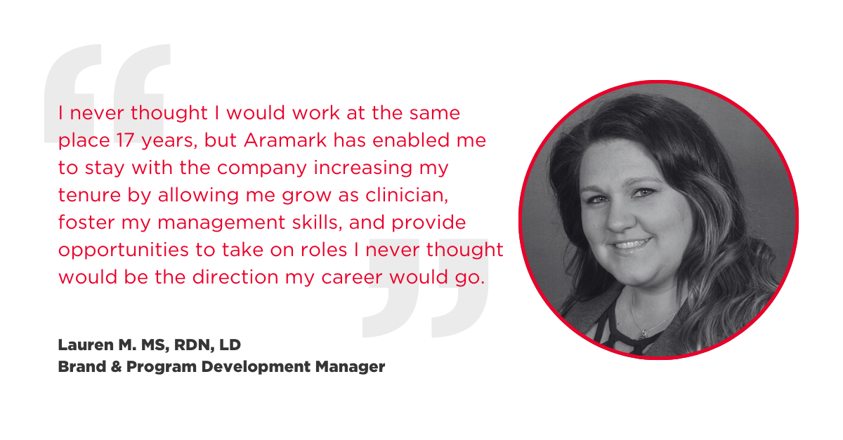 Lauren started her career with Aramark 17 years ago working in various dietitian and leadership roles and now serves as a Brand & Program Development Manager in the Healthcare+ Center of Excellence. Originally a chemistry major, she, with the encouragement of her mother, decided to become a dietitian so she could blend her love of science, food, and the medical field together into one successful career.