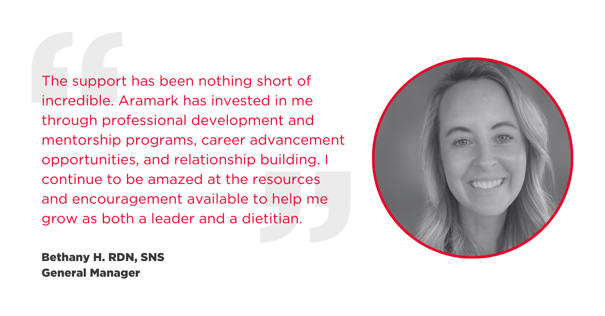 For Rachel, the decision to take this path as a dietitian was sparked by her own personal experience as a teenager. “What started as a tumultuous relationship became a love for learning the science behind something so simple and yet so complex, food.” At Aramark, she gets to share her passion for food and be recognized for her value with others in an environment that provides for organic growth, leadership, friendship, and a culture of excellence where that passion is nurtured.